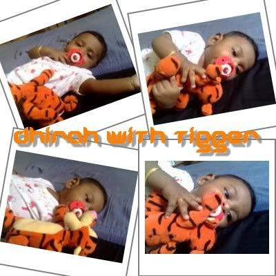 Dhirah was so hepi 2 b able 2 play wif tigger, d soft toy I get 4 her not long ago. Tried 2 get her elmo but jz cun get d 1 I'm lukin 4.. Perhaps soon. Will cont luk 4 it.. But d ting I had abt Dhirah playin wif her toys is.. she likes to put tings into her mouth.. Haizz.. Lyt earlier, tigger's nose got wet coz of Dhirah's doin. Hehee..
