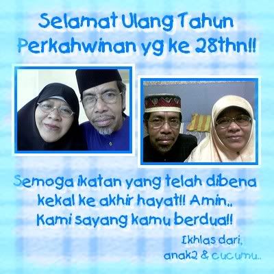 Slmt ulang thn p'nikahan yg ke 28thn ya mak, baba!! Smoga ikatan ni kekal hendaknye ke akhir hayat. Amin!! Ders not much celebration todae coz we intend 2 clear up d hse sinz both d toilet reno r almoz done. Lots of tings 2 clear. But I dun tink we'll manage 2 fnis up all today. Gotta do bit by bit.