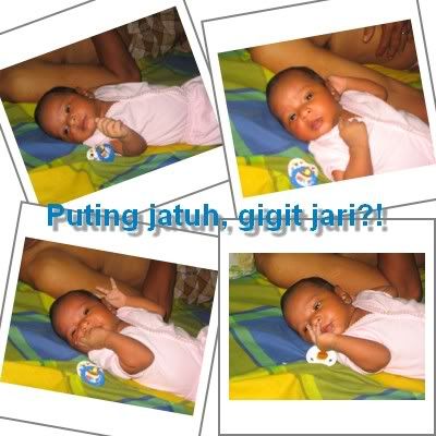 Todae, Nadiah genap sbln. Cpt seh msa b'lalu. Da bsr anak aku. Hehee.. Act, suppose 2 go 4 her injection todae but I changed her appt 2 Monday instead. Nadiah, dia active skit dari kakak dia esp @nite. Bila mlm jek, mata dia bukak besar. Tnak tdo tpi dia tak crewet or nangis ar. Alhamdulillah, if not.. da org kna lyan dia nye nangis nti. But 1 ting, biar dia duk cradle. Coz kat cradle dia duk diam, nti dia tgk sna, tgk sni.. but if kita baring kan dia @katil/playpen, dia cam rimas n sure dia mrengek mintak d dukung etc.