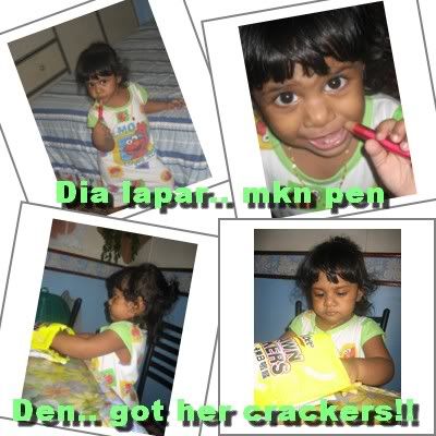 Bring her to kitchen finding her kropok. She holds my hand n pulled me to d dining table n starts pointing to something. Knw wat isit? Its a pkt of prawn cracker! hehehe.. And so, she starts munchin n munchin till she's got enuf of it.