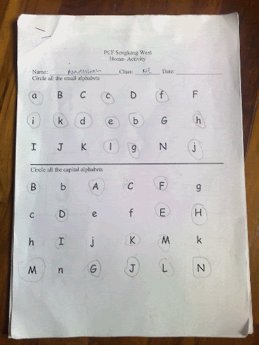 But since we'll be a lil bit bz tmr, so I made her do it today.. With the help from mum and Zalie.. Seriously, I had difficulty making Nadhirah to start writing though it was just a simple task for her to do.. That is to circle the small/big letters. And she just refused to. Even after I